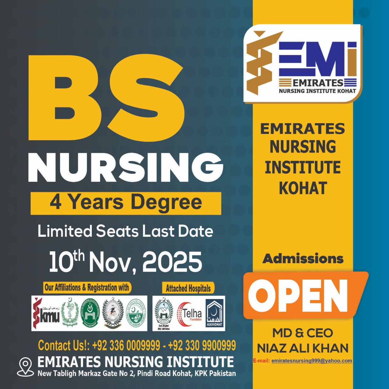 Emirates Nursing Institute Kohat (EMI Kohat) was established with a vision to "be a national and international centre of excellence in healthcare education, nursing training, and community development" and a mission to "offer an unparalleled learning experience in nursing and allied health sciences with a resolve to produce ethical and dedicated healthcare professionals who will deliver evidence-based quality healthcare globally, and produce a visible impact on the health of the community".