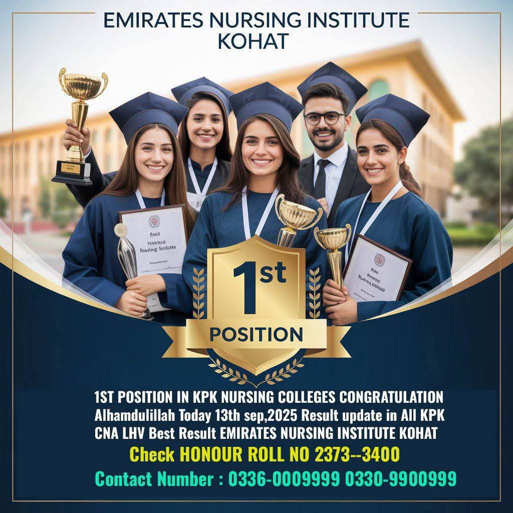 Emirates Nursing Institute Kohat (EMI Kohat) was established with a vision to "be a national and international centre of excellence in healthcare education, nursing training, and community development" and a mission to "offer an unparalleled learning experience in nursing and allied health sciences with a resolve to produce ethical and dedicated healthcare professionals who will deliver evidence-based quality healthcare globally, and produce a visible impact on the health of the community".